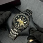 Унікальний напис на циферблаті, поєднання чорного та золотого кольору, класична форма та надійний сталевий ремінець створюють образ, який говорить без слів. Це вибір для тих, хто цінує індивідуальність, символіку та якісний стиль.